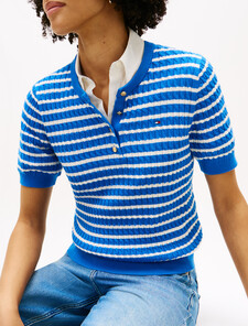 Crafted from soft pure cotton with fine-gauge cable-knit detailing, this short-sleeve jumper makes a perfect layer for transitional seasons.