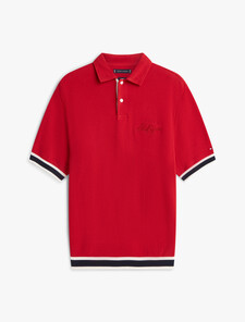 Tommy’s essential polo shirt is reimagined in flat-knit cotton, detailed with two-tone stripes and Tommy Hilfiger embroidery.