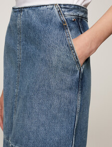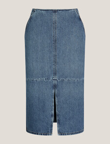 Channel the retro spirit with this soft yet sturdy denim skirt made from regenerative cotton. The high-waisted, fitted silhouette features a paneled design and a front slit. A metallic flag applique on the side adds a subtle branded touch.