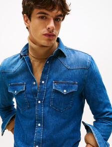 Evoke authentic Americana style with this Western denim shirt, complete with contrast stitching, faded seams and pearled snap buttons.